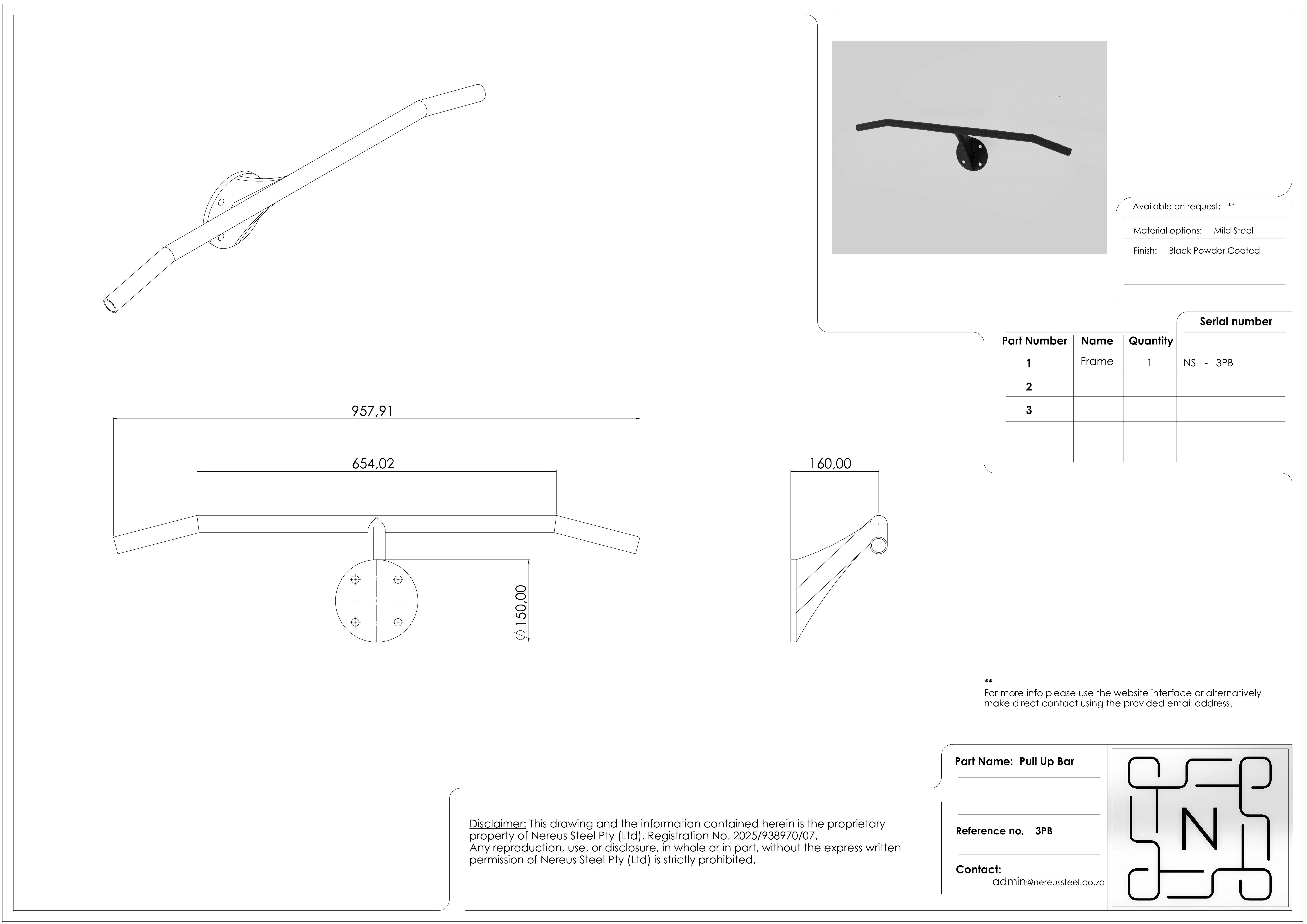 This pull up bar is made from welded mild steel, and frame is supplied powder coated black. This part is available in Stainless Steel. Please email admin@nereussteel.co.za for additional costing.